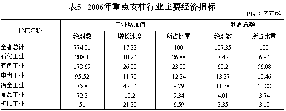 經濟運行質量提高。全年規模以上工業企業盈虧相抵后,實現利潤總額107.35億元,比上年增長62.69%,其中國有及國有控股企業實現利潤85.25億元,增長61.40%。規模以上工業中,集體企業實現利潤4.26億元,增長84.97%;股份制企業實現利潤47.94億元,增長26.58%;外商及港澳臺企業實現利潤2.33億元,增長51.03倍。規模以上工業虧損企業虧損額73.19億元,比上年增長43.43%,其中國有及國有控股虧損企業虧損額69.62億元,增長50.12%。 支柱行業增勢強勁,支撐作用不斷加大。石化、有色、電力、冶金、食品和機械等支柱產業完成工業增加值占規模以上工業的88.01%,其中:石化工業完成增加值208.10億元,比上年增長10.24%;有色工業完成增加值178.69億元,增長26.28%;電力工業完成增加值95.52億元,增長11.78%;冶金工業完成增加值75.80億元,增長45.04%。