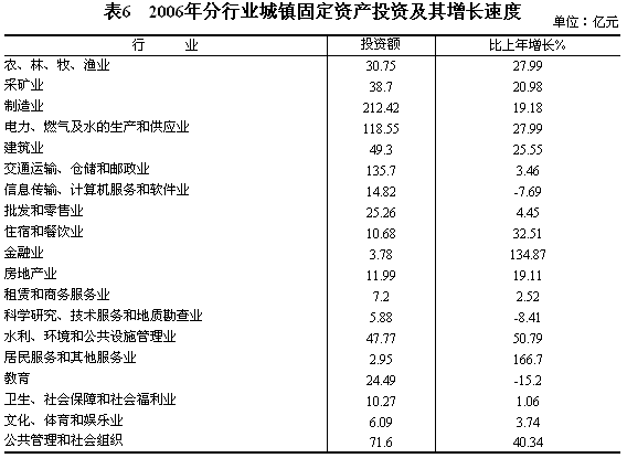 全社會固定資產投資中,第一產業完成投資52.02億元,比上年增長24.24%;第二產業完成投資436.96億元,增長23.73%,其中完成工業投資384.13億元,增長20.54%;第三產業完成投資535.89億元,增長11.02%。 城鎮固定資產投資中,制造業投資212.42億元,比上年增長19.18%,交通運輸、倉儲和郵政業投資135.70億元,增長3.46%,電力、燃氣及水的生產和供應業投資118.55億元,增長27.99%。