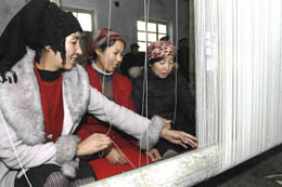 幫助群眾就業。1月3日,在新疆庫車縣庫木艾克社區居委會,老師左然木(左一)在教農民織地毯。新華社記者:季春鵬 攝 |