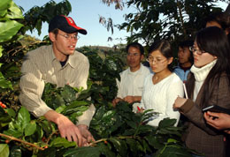 揚帆工程走進云南,旨在幫助全國大學畢業生成功就業?Х确N植專家鄔特(左一)在為云南農業大學應屆畢業生介紹小粒種咖啡種植技術。新華社記者:王呈選