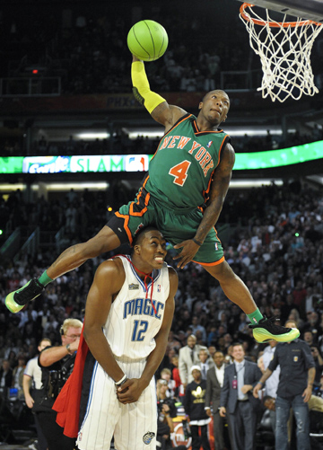 | 羅賓遜(上)與霍華德 | 今年NBA全明星賽的最有價值球員(MVP)獎杯頒給了“OK”組合——“大鯊魚”奧尼爾和科比·布萊恩特這對昔日洛杉磯湖人隊的歡喜冤家。 在這場西部明星隊以146:119大勝東部明星隊的比賽中,科比得到了全場最高的27分,奧尼爾只砍下了17分,但這位15次入選全明星賽(全聯盟排名第二)的大塊頭,仗著比賽是在自己母隊的主場進行,儼然成為場上最為搶鏡的主角。奔著“四張”去的奧胖還是那副“搞笑大師”的做派,以夸張、詼諧的表演成為全場最能愉悅觀眾的球員。結果,經球迷和媒體投票,奧尼爾和科比一起當選MVP。 劉德華前幾年拍了一部《大塊頭有大智慧》的電影,而奧尼爾幾乎在每次全明星賽上都告訴你什么是大塊頭有大幽默。比如2007年拉著“小皇帝”詹姆斯一起跳的那段相當專業的大屁股街舞,再比如他總是能把那雙球鞋弄出花樣(改裝成遙控車或是老虎機)。沒有奧胖的全明星賽是不可想象的,去年新奧爾良缺了這個“開心果”,很多人都感到不爽。 與“鯊魚”一同閃耀NBA全明星周末的是小飛人內特·羅賓遜(紐約尼克斯隊)。后者憑借1.75米的身高,在扣籃大賽中擊敗了海拔2.11米、披著“超人”斗篷的德懷特·霍華德,一舉成為“扣籃王”。這是小飛人繼2006年之后又一次拿到該獎項,此前只有“飛人”喬丹等四人先后獲得過兩屆“扣籃王”稱號。 當然,羅賓遜要好好感謝一下甘為陪襯的霍華德。前者在決賽中一身綠裝,有意讓人聯想起漫畫中專門抑制“超人”能力的元素“氪”,還事先安排披著“超人”斗篷的霍華德作為人梯。后者沒有考慮輸贏,而是將全明星周末的娛樂性發揮到極限,不假思索地就答應下來,于是兩人上演了一幕“小個子飛躍超人”的好戲。雖然今年的全明星“票王”霍華德沒能舉起扣籃大賽的獎杯,但其天生的搞笑細胞和娛樂大眾的良好意識,已經得到了NBA內外的一致認可。有媒體評論說,謝天謝地,“大鯊魚”奧尼爾在全明星周末的耍寶角色終于后繼有人了。 和羅賓遜一起“飛”起來的,是俄羅斯女子撐桿跳高奧運冠軍伊辛巴耶娃。2月15日,她在烏克蘭舉行的一項年度大賽中將橫桿的位置提升到5米的高度。伊娃在第二跳時躍過了這一高度,奉獻了一項新的世界紀錄。 飛得高的是飛人,跑得快的也是飛人。 牙買加飛人博爾特雖然不久前被指在酒吧大跳“臟舞”,但2月14日情人節那天的比賽結果表明:北京奧運會的男子百米冠軍并沒有荒廢武功。在牙買加首都金斯敦舉行的2009年坎伯當精英賽上,博爾特參加了男子400米比賽,以不可動搖的優勢獲得了冠軍。博爾特的成績并不算好,只有46秒35,遠遠落后于這個項目的世界紀錄43秒18(1999年由美國人邁克爾·約翰遜創造),但其象征意義卻很大:這個目前世界上跑得最快的人(奧運會100米和200米雙料冠軍),終于要向男子400米發起總攻。 回頭來看,博爾特的酒吧丑聞只是一個小插曲,盡管紙醉金迷的時光很誘人,但博爾特并沒陷入其中而樂不思蜀。其經紀人希姆斯曾披露,盡管新年前后“閃電”博爾特的社交活動比以往要多,但他并沒有放松冬訓,只不過放緩了一下訓練進度。希姆斯的話還可以這樣理解,博爾特是個聰明又本分的運動員,既可在放松的時候玩到忘乎所以、不顧形象,又知道什么時候返回訓練場,向著更高的目標發起挑戰。身為公眾人物,博爾特狂泡酒吧、濫秀舞技,估計當不上道德楷模,但至少守住了一個靠身體吃飯、憑成績拿獎金的職業運動員的底線,這可比國內一些足球運動員場下胡鬧場上腿軟強得多。博爾特的教練邁爾斯也替弟子高興,他希望博爾特能在2010年實現“大滿貫”,把男子100米、200米和400米三項世界紀錄攬入懷中。 替弟子高興的還有孫海平。中國的“翔飛人”在美國接受手術后,其傷口恢復得相當好,雖然再次騰飛還提不上日程,但距離人們的希望又近了一些。按計劃,劉翔將在本月底或是下月初回國,到時候,他一定要在眾目睽睽下稱重,看看到底是胖了還是瘦了。似乎是在春節前,有媒體誤傳翔飛人增重30斤,“雷”倒了國內一干“粉絲”。有人就此揶揄說,如果“翔飛人”胖得沒了樣,那一定是在養病期間不小心多喝了幾箱其代言的某種碳酸飲品,就是顏色黑黑的、味道有點兒苦的那種。
