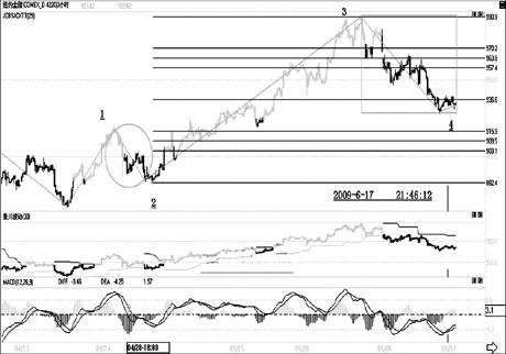 圖一:黃金在重要阻力位1000美元附近遇阻回落,市場進入4浪性質的蓄勢整理行情當中,后市一旦沖破1000美元阻力,則上升空間將被放大。