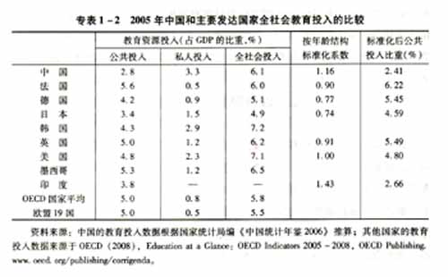 其次,對教育投入的總體規模,與一個國家的人口年齡結構相關。由于中國目前總人口中仍然有更大比例的人口處在受教育階段,因此,標準化后的實際公共投入為GDP的2.4%,不僅與發達國家的水平差距進一步擴大,而且低于印度的2.7%。