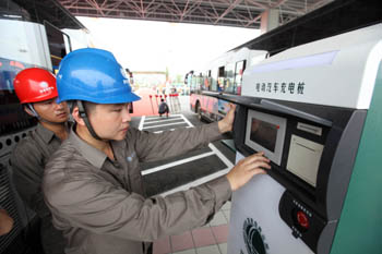 8月10日,在湖北襄樊市鄧城電動汽車充電站,工作人員準備為電動大客車充電。 當日,襄樊市鄧城電動汽車充電站正式投入使用,它是湖北首座電動汽車充電站。該充電站可同時為10輛大巴、20輛中巴和30輛轎車充電。它還設有50組蓄電池的電動汽車換電區,可直接更換蓄電池,減少電動汽車電能補給時間,滿足應急充電需求及長途旅行需要!⌒氯A社發(張文華/攝)