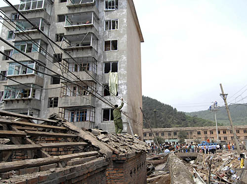 爆炸現場附近的一棟樓房的窗戶多被震碎。新華社記者 李鋼