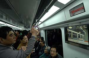 | 10月7日,北京地鐵5號線下午2:00正式售票開通試運營,軌道交通全路網票價2元.北京市民可以乘坐地鐵直接從城南豐臺區的宋家莊到達城北昌平區的天通苑。圖為乘客正在看5號線地鐵車里的顯示器。新華社記者