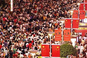 今年“十一”黃金周,全國共接待旅游者1.46億人次。圖為游客在上海南京路步行街參加國慶觀燈活動。(新華社發) 短評