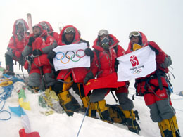 5月8日,登山隊員在峰頂展示中國國旗、奧運五環旗和北京奧運會會徽旗。當日,北京奧運圣火珠峰傳遞登山隊成功登頂珠峰,北京奧運圣火珠峰傳遞獲得圓滿成功。