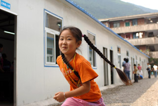 9月1日,在漢中市略陽縣高臺小學,一名小學生在活動板房教室前玩耍。當日,陜西地震災區漢中市2191所中小學、幼兒園全部按時開學,所有師生將在安全的校舍上課和食宿。新華社記者:丁海濤 攝