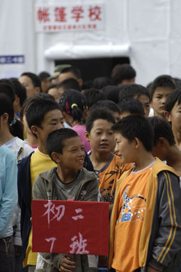 9月8日,攀枝花地震重災區元謀縣姜驛鄉15所中小學校全部開學。在姜驛中心小學,740名四里八鄉的彝族、傈僳族孩子們,走進了解放軍叔叔為他們新搭建的“帳篷學!,領到了部隊贈送的各種文具及生活用品。