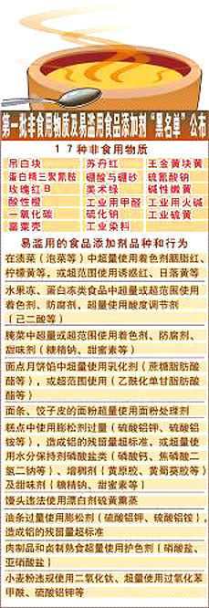 為配合全國打擊違法添加非食用物質和濫用食品添加劑專項整治工作的開展,專項整治領導小組日前下發通知,公布第一批“食品中可能違法添加的非食用物質和易濫用的食品添加劑品種名單”,其中包括17種非食用物質和10種易濫用的食品添加劑。17種非食用物質包括:吊白塊、蘇丹紅、王金黃塊黃、蛋白精三聚氰胺、硼酸與硼砂、硫氰酸鈉、玫瑰紅B、美術綠、堿性嫩黃、酸性橙、工業用甲醛、工業用火堿、一氧化碳、硫化鈉、工業硫磺、工業染料、罌粟殼。[詳情]