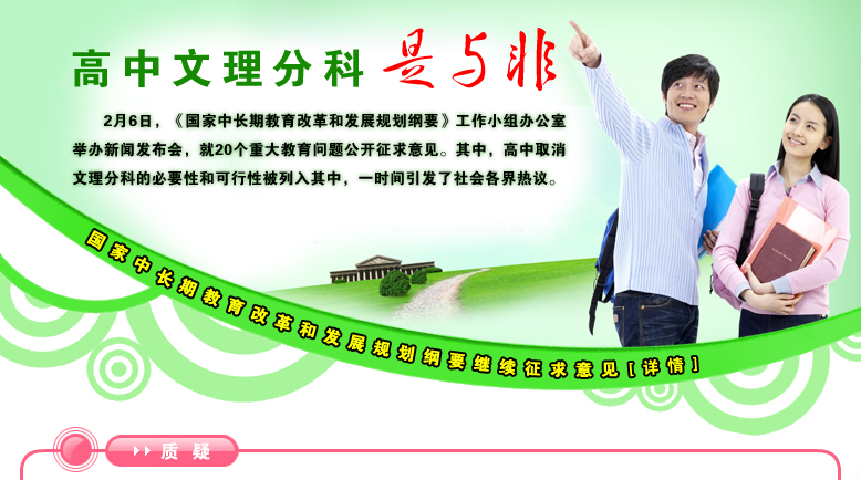 文理分科制度,始于1977年恢復高考,但分科教育的歷史淵源可追溯至新中國建立初期。當時,我國的教育很大程度上模仿了“蘇聯模式”。按照蘇聯的模式,教育要培養專才,知識的學習都朝著專業化路子邁進。學科有分化的趨勢,大學也有了“分學”的傳統。同樣為適應專業教育,恢復高考后,高中開始了文理分科。 上世紀末,受歐美國家教育理念影響,大學也由“分學”的傳統走出,有了“合并”的趨勢。與此同時,通識教育、素質教育理念也被人們大肆提倡。取消文理分科,因此而有了思想上的背景。[詳情] | | |