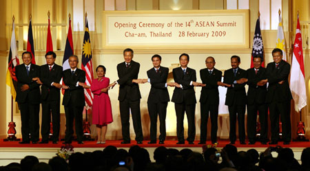 前不久,在第十四屆東盟首腦會議開幕式上,東盟國家首腦手拉著手,向世界表示東盟是友好、合作、堅強的團體。新華社記者:張鳳國