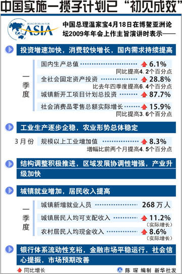 2009年第一季度的宏觀經濟處于全球金融危機深化和積極財政政策與適度穩健貨幣政策的共同影響之下,總體形勢處于震蕩期。從各項指標看,雖然擴大內需、促進經濟平穩較快發展的一攬子計劃已經初見成效,經濟運行表現出許多積極特點,但仍處于下行區間。這一階段經濟發展的特點包括:(1)經濟增長速度趨緩,但總體形勢好于預期;(2)外部需求持續萎縮,中國外貿、外資形勢嚴峻;(3)固定資產投資增長加快,投資結構有所改善;(4)消費保持較快增長,國內需求穩步提高;(5)銀行體系流動性充裕,貨幣信貸快速增加;(6)工業生產逐步企穩,農業生產形勢總體穩定,金融企業經營狀況良好。