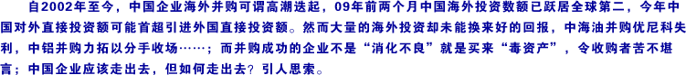價值從歷史高點下跌了約40%,但同期中國企業的國內并購交易額卻增長了約10%。 中國國內并購活動持續增長的原因有二。第一,政府主導了很多國有企業為龍頭的行業整合。當前的經濟困難正讓政府有機會促成一些過去可能受到抵制的整合交易。第二,資產負債狀況良好的中國企業抓住機遇收購實力較弱的本地企業。與2008年國內并購交易的紅火相比,中國企業在國外的并購清淡了許多。[詳細] | | | |