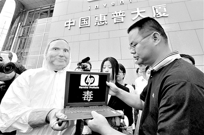 6月25日,在北京中國惠普大廈門前,惠普公司員工從穿戴面具和防護服的綠色和平組織志愿者手中接過寫著“毒”字的惠普舊筆記本;萜赵2007年向全球消費者做出承諾:將在2009年年底之前逐步淘汰其電腦產品中諸如溴化阻燃劑和聚氯乙烯等有毒物質。然而,2009年年初,惠普卻在其網站上宣布將履行承諾的時間推遲至2011年,此舉招致綠色和平組織志愿者的不滿并上門聲討。新華社記者金良快