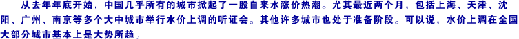 | 國家發改委在2006年提出的城市供水定價成本監審辦法,對城市供水定價給出了基本的規范,即城市供水定價成本由合理的制水成本、輸配成本。[詳細] | |