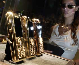 27日,一名參觀者在莫斯科舉行的奢侈品展覽會上欣賞一款鍍金手機。奢侈品云集的莫斯科奢侈品展是歐洲頂級奢侈品展覽之一,本次展覽于10月27日開始,將在10月30日結束。