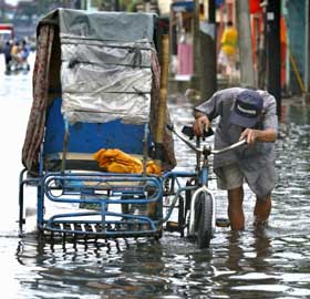 30日,在菲律賓首都馬尼拉郊外的馬拉邦,一名居民在強臺風“西馬侖”帶來的積水中艱難行進。當天,強臺風“西馬侖”繼續在菲律賓呂宋島北部肆虐,已經造成至少2人死亡。