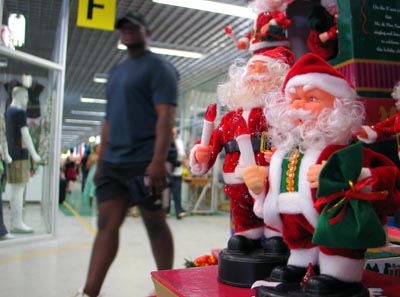 11日,在南非約翰內斯堡的東方商城,購物者走過產自浙江義烏的圣誕老人玩偶。南非的圣誕禮品市場現已進入最紅火的銷售階段,中國制造的圣誕禮品因為物美價廉、品種多樣而受到當地消費者歡迎。