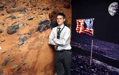 18日,在美國加利福尼亞州,美國宇航局艾姆斯研究中心戰略商業發展部主任克里斯·肯普在1996年拍攝的火星表面照片(左)和1968年拍攝的月球和地球照片(右)前留影。網絡搜索引擎谷歌(Google)將和美國宇航局合作,在網絡上提供美國宇航局發布的圖片,三維地圖和航天飛機的實時信息。