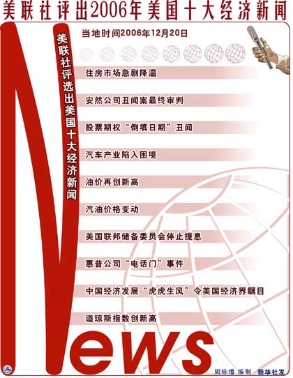美聯社20日評選出今年美國十大經濟新聞。其中,美國房地產市場急劇降溫名列榜首,安然公司財務丑聞的最終裁決位居第二。