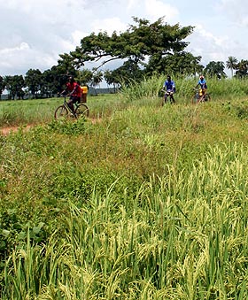 中墾集團下屬的中幾農業合作開發公司自1997年起在幾內亞首都科納克里附近的科巴農場開展水稻種植項目。幾年來,科巴農場不僅在解決幾內亞人民吃糧難的過程中發揮了重要作用,而且幫助周圍數百戶居民掌握了水稻種植技術。這是幾內亞科巴農場的工人騎車經過即將豐收的稻田。新華社記者