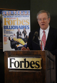 宣布全球個人財富排行榜之際,《福布斯》雜志總編輯史蒂夫·福布斯8日說,“億萬富翁名單的擴大,純粹是全球經濟蓬勃發展的反映! 以人數衡量,與2005年排行榜列出793人相比,全球達到或超過10億美元的富豪2006年增加153人,增幅為19%。 以截至今年2月9日的市場價值衡量,這些富豪2006年的資產市值合計35萬億美元,比2005年增加9000億美元,上升35%。富豪們的人均資產市值為36億美元。 以地域分布衡量,946名富豪出自53個國家和地區,其中包括財富首次達到或超過10億美元的塞浦路斯、阿曼、羅馬尼亞和塞爾維亞人。 以年齡衡量,這些富豪平均62歲,與2005年相比降低了兩歲。 排行榜同時還揭示,在2005年上榜者中間,2/3的富豪2006年變得更為富裕,僅有17%變得相對“貧窮”,其中32人就此落榜,即資產價值低于10億美元。 依照《福布斯》雜志編輯路易莎·克羅爾和艾莉森·法斯的判斷,在這些富豪個人財富增加的背后,存在著全球經濟大環境的推動因素,那就是:2006年資本市場強勁,房地產價值攀升以及期貨市場價格上揚。 就此,雜志總編輯史蒂夫·福布斯作出判斷:“在我們這個地球上,更多的人經濟狀況好于以往……這(2006年)是人類歷史上最為富足的年份! 然而,克羅爾和法斯解釋說,富豪們的資產價值處于不斷變動狀態,排行榜所列數字未必反映當前狀況。在數據截止的今年2月9日至排行榜定稿的3月2日之間,摩根士丹利公司發布的全球股票市場指數下降3.7%,一些富豪所受影響不大,另一些富豪則損失慘重。 例如,西班牙富豪恩里克·巴紐埃洛斯現年41歲,主營房地產業,在排行榜上排名第95位,所列資產市值截至2月9日為77億美元。但是,股市近期動蕩的過程中,巴紐埃洛斯的資產市值4天內“縮水”30%。