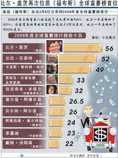 | 美國《福布斯》雜志近日公布2006年度全球個人財富排行榜,羅列了截至2月初個人資產市值達到或超過10億美元的946人。 按照排行榜制作者的說法,《福布斯》排行榜不只是個人財富的簡單羅列,同時也是全球經濟及其變化的曲折反映。而近年來亞洲經濟的蓬勃向上,也讓財富榜上涌現出越來越多的亞洲富豪。
