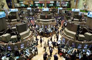 23日,美國紐約證券交易所股票交易大廳一片繁忙。當日,道瓊斯指數盤中創下12983.92點的歷史新高后,收盤下跌42.58點,收于12919.40點,跌幅為0.33%。新華社記者 侯俊 攝