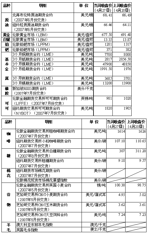 國際市場當周貴金屬及絕大多數基本金屬的期貨價格紛紛下滑,這主要是由于在4月26日的紐約匯市上,美元對西方其他主要貨幣的比價出現短暫上升所致。 國際油價當周起伏不定,這主要是受非洲第一大產油國尼日利亞形勢趨緊、美國汽油庫存大幅下降、武裝分子曾企圖襲擊全球第一大石油出口國沙特的石油設施以及交易者獲利回吐等因素影響所致。 4月23日,尼日利亞安全部隊再次與武裝分子在該國南部產油區發生交火,造成至少7人死亡。交易者對尼日利亞暴力活動可能影響該國原油供應的擔心是推動當天油價大幅上漲的主要因素。而次日受交易者獲利回吐的影響,國際油價又大幅回落。 美國能源部4月25日公布的最新數據顯示,在截至4月20日的一周里,盡管美國商業原油庫存增加了210萬桶,增幅高于市場預期,但汽油庫存繼續大幅下降,降至1.942億桶,降幅達280萬桶。由于美國夏季汽油消費高峰期即將到來,汽油庫存大幅下降引發了交易者對汽油供應的擔憂,致使當天油價大幅上漲。次日,受交易者趁油價處于相對高位時采取獲利回吐操作影響,油價再次出現回落。在當周最后一個交易日,油價又大幅上漲,這是由于武裝分子曾企圖襲擊沙特的石油設施加重了交易者對石油供應安全的擔憂。 受投機者獲利回吐操作影響,咖啡價格下滑,其中紐約市場咖啡價格跌至自2006年10月20日以來最低點——每磅106.75美分。 由于市場對西非干旱天氣擔憂有所緩解,可可期貨價格順勢下滑。因市場預計糖供給過剩,糖價繼續下挫。 谷物類價格相對較穩定。艾倫代爾公司分析師喬·維克托指出,澳大利亞、法國及德國非常干旱的天氣依然支撐著小麥價格。