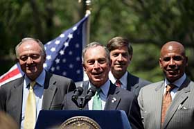 作為東道主,布隆伯格還向來賓介紹了紐約市的“綠色紐約”計劃。日前,布隆伯格提出了涉及10個領域的127項環保提案,其中包括對節能項目進行支持、提高建筑物的環保標準、大力發展公共交通等,以期達到2030年全市減排30%溫室氣體的目標。其中,爭議較大的是對進入曼哈頓繁華地段車輛征收交通擁堵費的提案。如這一提案獲紐約州議會通過,紐約市將成為繼倫敦、新加坡、斯德哥爾摩之后采取此項措施的第四個大城市。