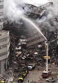 美國消防人員向紐約世界貿易中心大樓廢墟上噴水。本報資料照片 |