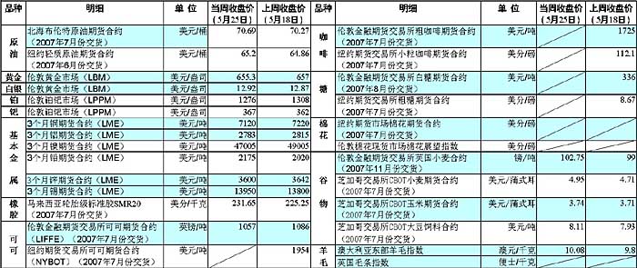 受中國將對精煉鉛征收出口稅的影響,當周鉛價創下歷史新高。而由于美國將進入夏季駕車外出高峰季節、非洲產油大國尼日利亞國內局勢動蕩以及伊朗形勢緊張,當周國際市場原油價格大幅上漲。 受中國從今年6月1日起出口精煉鉛將征收10%的關稅的影響,當周鉛價創下歷史新高。法國巴黎銀行分析師戴維·賽圖表示:“西方一些國家的鉛供應將會因為中國對精煉鉛征收出口稅受到影響,致使鉛供不應求,這是當周鉛價大幅上揚的主要原因! 24日,倫敦國際石油交易所7月份交貨的北海布倫特原油期貨盤中價格一度達到每桶71.8美元,為去年8月28日以來新高。市場分析人士指出,下周一市場因美國陣亡戰士紀念日停市一天,另外汽油消費將在下周進入高峰期,投資者在長周末前對市場供應的擔心導致油價上漲。此外,尼日利亞發生綁架和罷工事件、伊朗局勢持續緊張也導致油價走高! 貴金屬方面,黃金價格當周有所下滑,受此影響鉑金價格繼續下滑趨勢。瑞銀集團(UBS)分析師約翰·里德認為,美元價格走強、基本金屬價格走軟以及投資者厭惡風險情緒不斷增強是當周黃金價格下滑的主要原因。此外,白銀價格略有上漲,美國金屬顧問公司GFMS的一份報告預測,今年年內白銀價格有望突破每盎司15美元,黃金價格也將達到每盎司700美元。 受投機者獲利回吐操作影響,可可期貨價格在創下四年以來新高后出現下滑。分析人士指出,可可主要生產地西非地區近來的極度干旱天氣還在持續,受此影響未來可可價格有望再攀新高。此外,谷物和大豆價格有所上漲。市場擔心全球小麥庫存緊張以及未來天氣狀況將對全球小麥生產不利,是推動當周小麥價格上漲的主要因素。而橡膠價格上揚的主要原因則是雨季天氣造成的原料供應緊張。