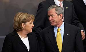 | 圖為德國總理默克爾(左)和美國總統布什。本報資料照片 | 八國集團(G8)首腦會議6日在德國舉行,氣候變化問題是本次峰會的最重要議題之一。 主席國德國在決議草案中提出了減少溫室氣體排放等建議,但建議遭到了全球最大溫室氣體排放國美國的“根本性反對”。峰會前夕,美國總統布什出人意料地拋出美國應對全球氣候變化的“長期戰略”,從而使八國集團能否就氣候變化問題達成有效協議變得更加難以預測。