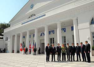 | 7日,在德國小鎮海利根達姆,出席八國集團首腦會議的八國領導人和歐盟委員會主席巴羅佐(右七)在會議期間合影。新華社/法新 | 八國集團(G8)首腦會議6日以非正式晚宴的形式在德國海濱小鎮海利根達姆拉開帷幕,與會領導人在接下來兩天的會晤中將撥動全球經濟的“琴弦”。 八國集團峰會的前身七國集團峰會曾被視為西方發達國家最高級別的經濟會議。雖然八國集團峰會的議題拓展到了政治和安全領域,但經濟仍是其重要話題。八國集團輪值主席國德國將今年峰會的主題確定為“增長與責任”,希望借此彰顯八國集團峰會的經濟本色。 八國集團領導人在7日舉行的首場會議中就全球經濟形勢展開討論,并展望全球經濟發展前景。按照會議議程,八國領導人和部分發展中國家的領導人還將討論全球氣候變化、非洲發展、對沖基金、知識產權保護和世界貿易組織多哈回合談判等問題。 得益于德國的積極推動,如何為全球氣候“降溫”成為今年峰會上最炙手可熱的話題。德國希望其他工業大國能夠共同承諾,到2050年實現全球溫室氣體排放比1990年的排放水平降低50%,全球平均氣溫上升不超過兩攝氏度。 八國集團峰會東道國德國總理默克爾7日下午宣布,經過艱苦談判,八國集團各方已同意“認真考慮”德國提出的關于到2050年全球溫室氣體排放量比1990年降低50%的建議。 此外,各方還同意,在聯合國框架內進行有關談判是解決氣候變化問題的合適途徑。默克爾認為,這是目前各方能夠達成的最佳妥協方案,是應對氣候變化努力的“一個真正的轉折點”。她還說,這一妥協向今年年底將在印尼巴厘島舉行的聯合國氣候大會傳遞了一個強烈的信號。 幫助非洲大陸擺脫貧困是八國集團峰會近年來的另一熱門話題。德國總理默克爾今年曾強調,八國集團不僅要向非洲提供援助,而且要與非洲國家建立伙伴關系,通過推行“良政”和發展當地金融業來促進非洲自身經濟發展。但分析人士指出,德國的“新方式”無異于“新瓶裝舊酒”,反而會淡化發達國家向窮國提供資金和技術轉讓等方面的責任。 近來在全球范圍內對沖基金規模日益壯大,由此帶來的風險也越來越大,引起了各國的警惕。東道國德國和其他一些歐盟國家將在本次峰會上尋求加強對對沖基金的監管,但由于美國持反對態度,這一議題恐怕同樣難以取得進展。 此外,為陷入僵局的多哈回合談判重新注入活力也是八國集團峰會討論的熱點。此次會議上,影響多哈回合進程的世貿組織重要成員基本到齊,他們能否打破僵局找到出路,前景并不樂觀。