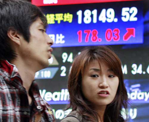 18日,兩名行人從日本首都東京的一個顯示股票信息的電子顯示屏前走過。日本最大的證券交易所東京證券交易所最新公布的股票分布情況調查結果表明,截至日本2006財政年度末(2007年3月底),在東京證券交易所等日本國內5家證券交易所(二板市場除外)交易的股票總值中,外國股東持有的比例達到28%,創歷史最高紀錄。