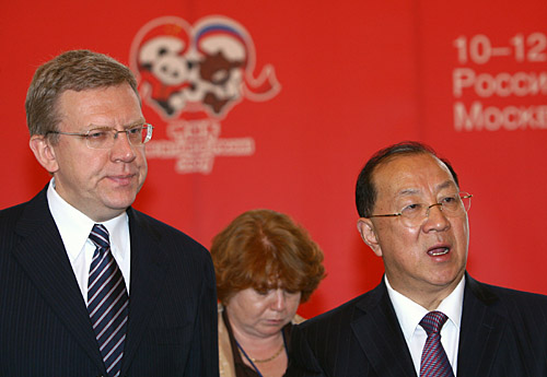 10日,中國財政部部長金人慶(右)與俄羅斯財長庫德林(左)在莫斯科參加中俄財長第二次對話會議后接受記者采訪。當日,中俄財長第二次對話會議在莫斯科召開,雙方就兩國經濟發展戰略、宏觀經濟形勢與政策等議題進行了交流。