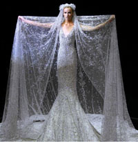 德國設計師卡爾作品 | 這場時裝秀的主題是“時間”,每個“像框”代表一種不同的時間概念!皞髌鏁r間”里,女模特身穿一件胸前綴滿白色表盤的黑色長裙,旁邊椅子上靜臥著一只大白兔!盎锇闀r間”里,兩個年輕女子守著一輛單車相依相伴!岸矶λ怪髁x時間”里,綴滿黑色、白色、紅色、黃色、藍色羽毛的直筒狀長上衣將模特裝扮得神秘莫測…… 近年來備受關注、尤其獲得好萊塢明星青睞的黎巴嫩設計師埃里·薩阿卜也在7月4日推出了秋冬時裝秀。他延續了一貫風格,以銀色、黑色為主色調,大量使用絲綢與亮片,服裝高貴奢艷又不失嫵媚飄逸。別出心裁的是,他將時裝秀地點選在了一個馬戲場內,場中央用來圈出表演場地的寬闊圓圈代替了常見的T型臺,更加便于環坐四周的觀眾就近欣賞衣服的美妙。