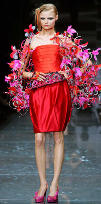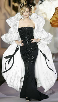 名設計師之所以有名,必有其不敗之處。例如,他們源源不竭、千奇百怪的創意與構思有時令人目瞪口呆,有時令人贊不絕口。 7月2日時裝周第一天,世界頂級時裝品牌迪奧為慶祝品牌誕生60周年,在巴黎近郊的昔日皇宮——凡爾賽宮內舉行了一場時尚派對,場面盛大,極盡奢華之能事。一批世界超模穿著令人眼花繚亂的華麗晚裝和上世紀40年代風格的西裝亮相,仿佛一個個美人兒從畫中走出。也難怪,這些服裝的創意本就來自達·芬奇、畢加索、米開朗基羅、莫奈、雷諾阿等大師的畫作,更何況它們出自迪奧的御用設計師——加利亞諾之手。舞臺背景音樂選擇了西班牙弗拉門戈舞曲,讓人憶起加利亞諾一半的西班牙血統。當加利亞諾身著華麗的傳統斗牛裝束現身,時裝秀現場氣氛達到高潮——這是他的風格,親自扮演最后一位讓人“驚艷”的模特。