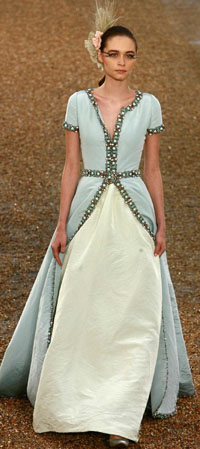 | 迪奧作品 | 另一位以創意大膽著稱的時裝界“頑童”讓-保羅·戈蒂埃則在7月4日讓人們大開眼界:一場純粹的女裝秀充滿了軍營氣息,甚至約定俗成最后一位出場的新娘也被帶著頭紗的新郎代替。 肩章,金色紐扣,垂在胸前的飾帶,被特意“拓”寬的肩膀……奢華、嫵媚的裙裝有了這些裝飾,平添一股英氣。軍服領上衣搭配緊身褲與長靴或者是帶褶痕、類似男褲的長褲,勃勃英姿呼之欲出。讓-保羅·戈蒂埃說,這場時裝秀體現了“女人才是強者”,因為女人可以在展現英姿的同時依然性感、敏感、浪漫。