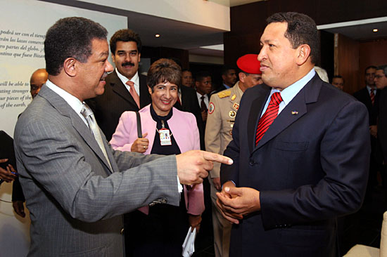 11日,委內瑞拉總統查韋斯(前右)在委內瑞拉首都加拉加斯與參加“加勒比石油計劃”締約國第三屆首腦會議的多米尼加總統萊昂內爾·費爾南德斯(前左)交談。