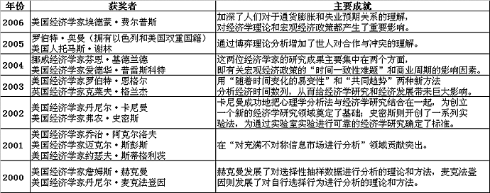 [相關鏈接]諾貝爾經濟學獎 根據瑞典著名化學家、硝化甘油炸藥發明人阿爾弗雷德·伯恩哈德·諾貝爾(1833-1896)1895年留下的遺囑,諾貝爾獎項只包括化學獎、物理學獎、文學獎、醫學獎與和平獎。諾貝爾經濟學獎是瑞典中央銀行在1968年為紀念諾貝爾而增設的,1969年第一次頒獎。截至2007年,已有61人獲此獎。 諾貝爾經濟學獎由瑞典皇家科學院院士組成的評委會評定,評委會包括5名到8名成員。每年評委會從世界各地收到的諾貝爾經濟學獎提名有200個到300個。在經過資格確認、初選、復選后,評選結果在10月的某個星期一公布。 諾貝爾經濟學獎可以頒發給單個人,也可以最多由3人分享,其主要目的是表彰有關人員在宏觀經濟學、微觀經濟學、新的經濟分析方法等領域所作的貢獻。今年的諾貝爾經濟學獎獎金為1000萬瑞典克朗。 每年12月10日,諾貝爾經濟學獎頒獎儀式在瑞典首都斯德哥爾摩舉行,瑞典國王親自向經濟學獎獲得者頒發獲獎證書、金質獎章和獎金支票。