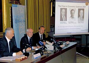 瑞典皇家科學院于北京時間15日晚7時宣布,將2007年度諾貝爾經濟學獎授予萊昂尼德·赫維奇、埃里克·馬斯金和羅杰·邁爾森三位美國經濟學家,以表彰他們在創立和發展“機制設計理論”方面的巨大貢獻。 瑞典皇家科學院在聲明中指出,“機制設計理論”在當代經濟學和政治科學領域扮演著十分重要的角色,最早在1960年由赫維奇提出,馬斯金和邁爾森則進一步發展了該理論。這一理論有助于經濟學家、各國政府和企業識別在哪些情況下市場機制有效,而哪些情況下市場機制無效。此外,借助“機制設計理論”,人們還可以確定最佳和最有效的資源分配方式。