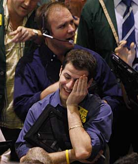 | 圖為交易員在美國紐約商品交易所中工作。由于市場擔心次貸危機繼續惡化,12日紐約股市全面下跌。新華社/法新 | 歐美投行次貸損失浮出水面