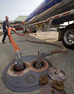| 圖為美國弗吉尼亞的一座加油站,一名汽油運輸司機正向加油站輸油。本報資料照片 | 高油價抑制需求效應顯現