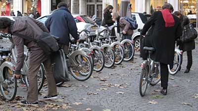 14日,巴黎市民在街頭取用市政府出租的公共自行車。由于公共交通系統的工人罷工,自行車成為巴黎上班族的重要交通工具。
