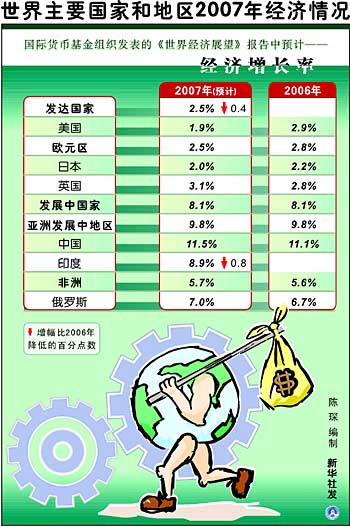 當前世界經濟形勢呈現兩大特點:一是總體增長有所放緩,但仍相對強勁;二是各經濟體間分化加劇,發達經濟體增長乏力,而新興市場經濟體則增長強勁。 在各主要經濟體中,發達經濟體成為世界經濟保持快速增長的不利因素。IMF的報告認為,美國經濟走勢尤其不容樂觀,其今明兩年經濟增長率均為1.9%,低于去年的2.9%,比原來的預測分別降低0.1和0.9個百分點?紤]到住房市場下滑和次貸危機沖擊,美國聯邦儲備委員會和白宮不久前也下調了對美國經濟增長的預期,并認為美國住房市場下滑的嚴重程度要高于預期。由于西方金融市場息息相關,美國次貸危機外溢也使得歐盟、日本和加拿大等其他發達經濟體增長放緩。 與發達經濟體增長放慢相對照,發展中國家尤其是新興市場經濟體發展前景相對樂觀,并未受到次貸危機的太大影響。據IMF預測,亞洲發展中地區經濟今明兩年增長率分別達到9.8%和8.8%,其中中國達到11.5%和10.0%,印度則為8.9%和8.4%。而撒哈拉沙漠以南非洲國家的經濟增長目前正處于40多年來最快的階段,該地區發展較快的一些國家在減貧方面取得了重大進展。 IMF的報告認為,新興市場經濟體正成為“世界經濟穩定的來源”。世界經濟正越來越依賴中國、印度、俄羅斯等新興市場經濟體的表現,過去一年全球經濟增長的50%來自中國、印度和俄羅斯。IMF認為,新興市場經濟體之所以取得如此顯著成就,除了經濟全球化的因素外,新興市場經濟體政府正確的決策是最重要的原因。