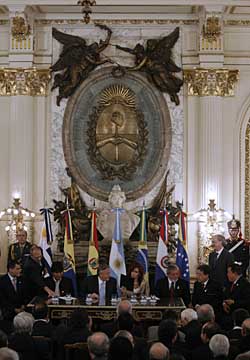 | 9日,厄瓜多爾總統科雷亞、玻利維亞總統莫拉萊斯、阿根廷總統基什內爾和當選總統克里斯蒂娜·費爾南德斯、巴西總統盧拉、巴拉圭總統杜阿爾特、委內瑞拉總統查韋斯(從左至右)在阿根廷首都布宜諾斯艾利斯出席南方銀行成立的簽字儀式。新華社發 | 本報布宜諾斯艾利斯電