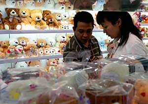 | 圖為一名美國客商在10月份舉行的第102屆中國進出口商品交易會(廣交會)展館中與工作人員商談玩具出口事宜。本報資料照片 | 關鍵詞一:貿易平衡發展